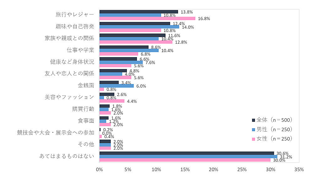 具体的に「2024年1年間でもっとも充実していたこと」を聞くと、「あてはまるものはない」30.6%が最多だが、「旅行やレジャー」13.8%、「趣味や自己啓発」12.4%、「家族や親戚との関係」11.6%が上位だった。コロナ禍を経て、旅行・レジャーが高まったと考えられる。男女別では、女性は「旅行やレジャー」16.8%が1位だったのに対し、男性は「趣味や自己啓発」14.0%が1位だった。