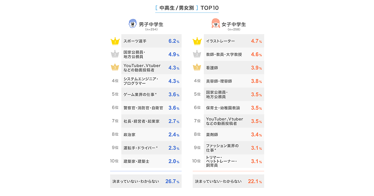 女子中学生では「イラストレーター」「教師・教員・大学教授」「看護師」が前年同様上位にランクイン。また、2023年はランキング外だった「美容師・理容師」が、2024年は4位までランクアップした。