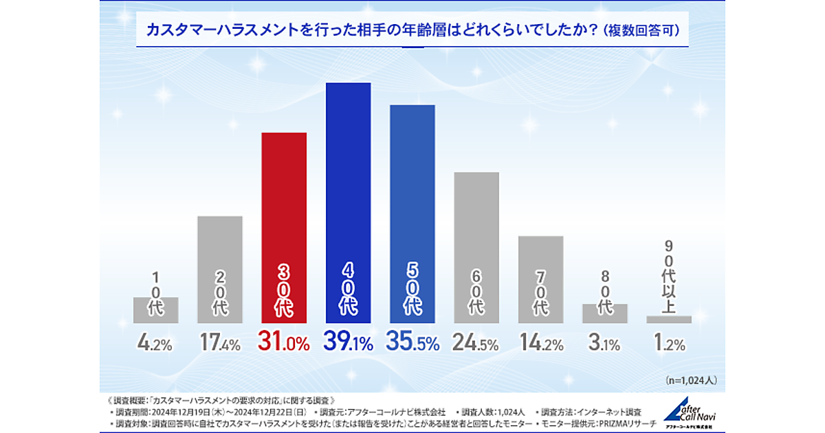 まず「カスタマーハラスメントを行った相手の年齢層」を聞くと、「40代」39.1%、「50代」35.5%がとくに多く、「30代」31.0%がそれに続く。