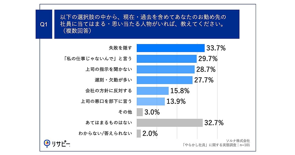 まず「やらかし社員」に関するイメージとして複数の選択肢から「勤め先社員で当てはまる・思い当たる人物」を聞いた。その結果「失敗を隠す」33.7%が最多で、以下「『私の仕事じゃないんで』と言う」29.7%、「上司の指示を聞かない」28.7%、「遅刻・欠勤が多い」27.7%が上位に並んだ。こうした特徴を持つのが「やらかし社員」だと言えるだろう。