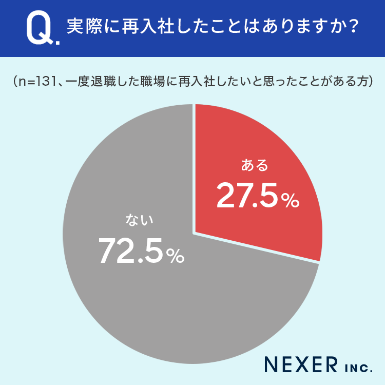再入社したいと思ったことが「ある」と回答した131人に、「実際に再入社したことはあるか」と聞くと、27.5%とかなり多くが「ある」と回答した。きっかけ・理由としては、「生活スタイルが変わった」「職がなく困っていた」「やり慣れた仕事をしたかった」のほか、「電話がかかってきた」などあらためて「誘われた」という理由も多かったとのこと。