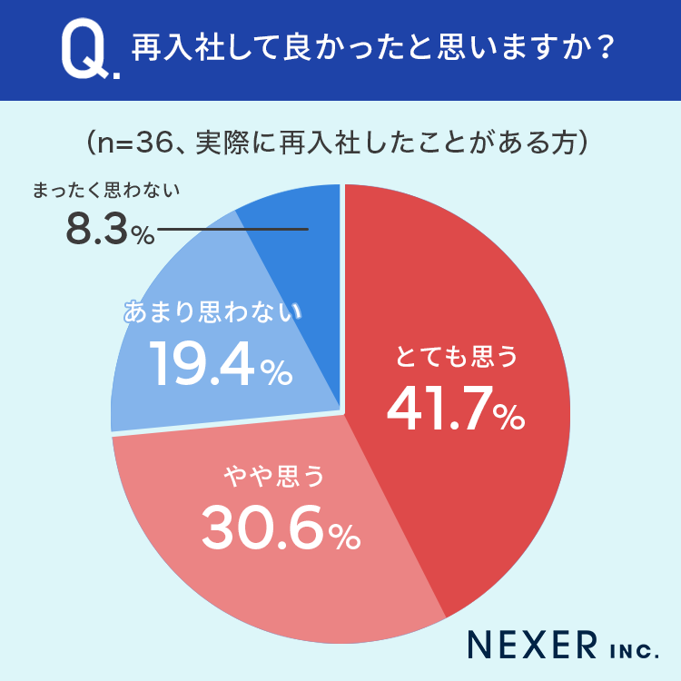 実際に再入社した36人に「再入社して良かったと思うか」を聞くと、「とても思う」41.7%、「やや思う」30.6%と肯定的な意見が多いが、「あまり思わない」19.4%、「まったく思わない」8.3%も存在。肯定的な理由では「あまり環境が変わっておらず、すぐに馴染めた」「そこの仕事が好きだと改めて感じた」「仕事をいちから覚える必要がない」といった意見があがった。