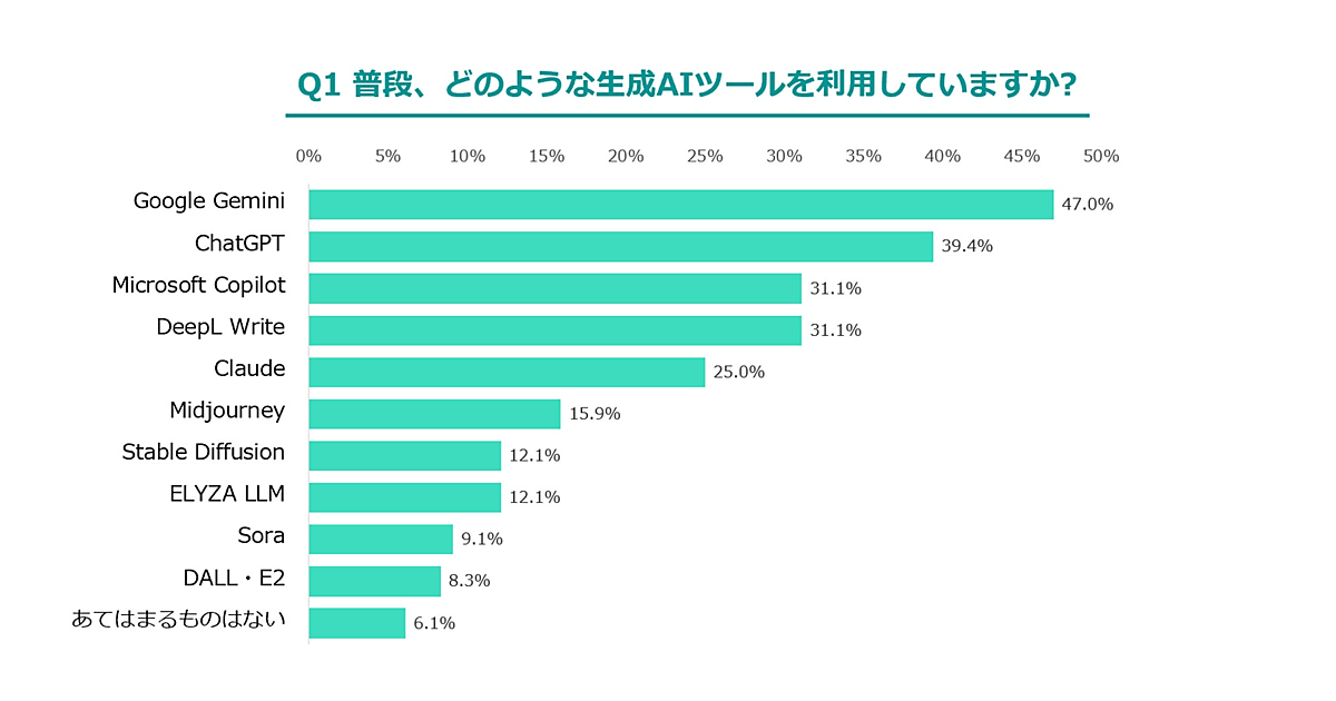普段利用する生成AIツールで最も多かったのは「Google Gemini」が47.0%。次いで「Chat GPT」39.4%、「Microsoft Copilot」と「DeepL Write」が同率で31.1%だった。画像生成や動画生成に特化した生成AIよりも、文章生成や翻訳を得意とする生成AIが使われているという結果になった。