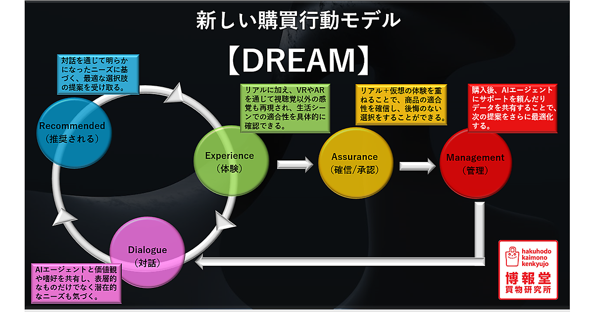 AIエージェントは、生活者の仕事や生活のサポートのために設計されたAIシステム。AIエージェントを使ったリコメンドなど購買体験が変化する中、DREAMを提唱。AIエージェントと生活者が協働する購買体験は、①Dialogue(対話)②Recommended(推奨される)③Experience(体験)④Assurance(確信/承認)⑤Management(管理)--の5つのプロセスで理解できる。