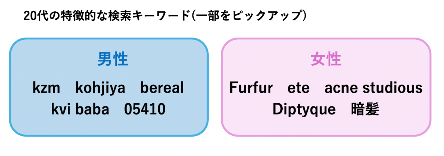 20代は、興味のあるジャンルが邦ロックからヒップホップにも拡大。女性は「FURFUR」(ファーファー)、「ete」(エテ)など、ジュエリーや香水などのブランドの検索が多い。