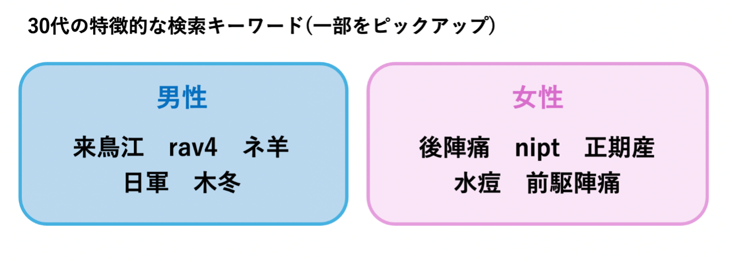 30代男性は、漢字の読み方の検索方法が特徴的で、たとえば「祥」という漢字を「ネ 羊」のように部首で分けて検索する様子が見られた。女性は「後陣痛」(こうじんつう)、「正期産」(せいきさん)、出生前検査を表す「nipt」(ニプト、出生前診断)など、出産に関する検索が多く見られた。