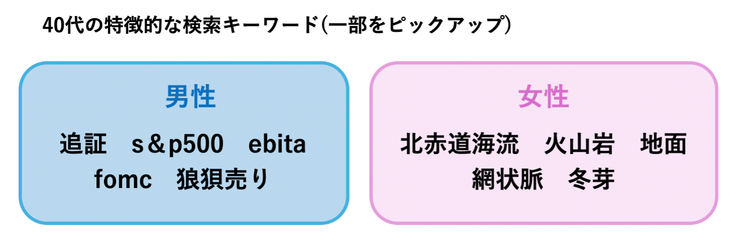 40代だと、男性は「追証」(おいしょう)、「S&P 500」(スタンダード・アンド・プアーズ500種指数)といった投資関連ワード、女性は「火山岩」「地面」など小学生が習うようなキーワードも検索されており、子どもといっしょに読み方を確認している可能性が考えられる。