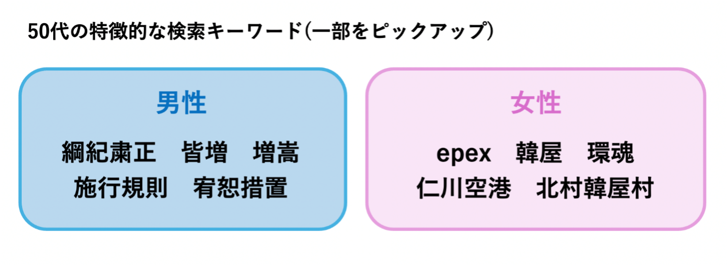 50代だと、男性は改正電子帳簿保存法関連の「宥恕措置」(ゆうじょきかん)が上位。女性は韓国に関連するキーワードの読み方を多く検索していた。