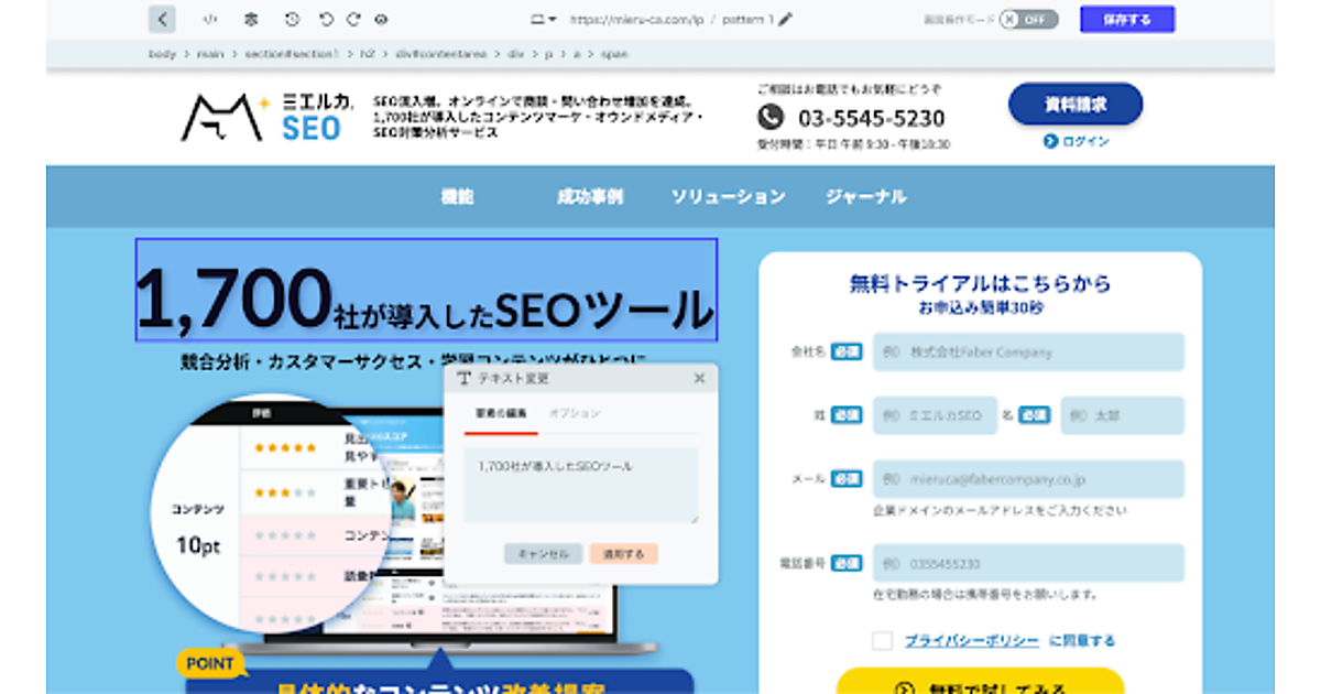 ウェブマーケティング支援事業のFaber Company(ファベルカンパニー)は、ウェブページがノーコードで編集できるエディタ機能「ページカエタロウ(β)」の提供を始めた、と1月23日発表した。データを色で可視化するヒートマップや、複数の案を比べてどれが効果的かを調べるABテストを利用して立案した改善施策が、実際のページにすぐ反映できるようになる。