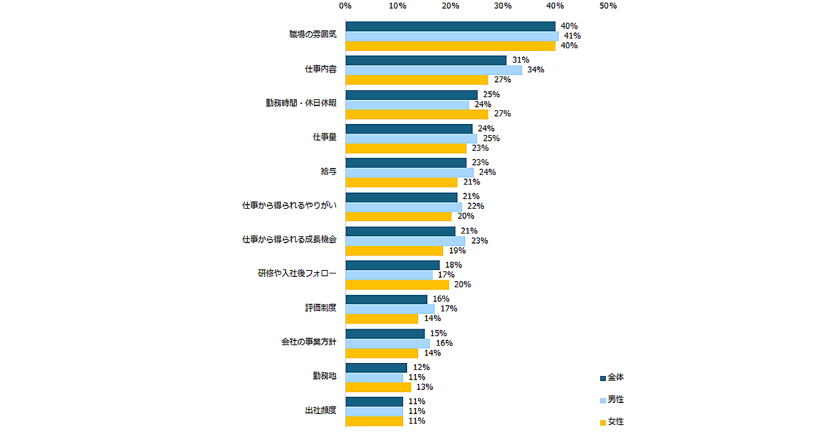 まず「入社後にギャップを感じた経験はありますか?」と聞くと、87%が「ある」と回答。あると回答した808人に「想定より良かったギャップ」「想定より悪かったギャップ」をそれぞれ聞くと、いずれでも上位に「職場の雰囲気」と「仕事内容」が並んだ。男女別では「想定より悪かったギャップ」で、男性よりも女性のほうが「仕事量」「勤務時間・休日休暇」が高かった。
