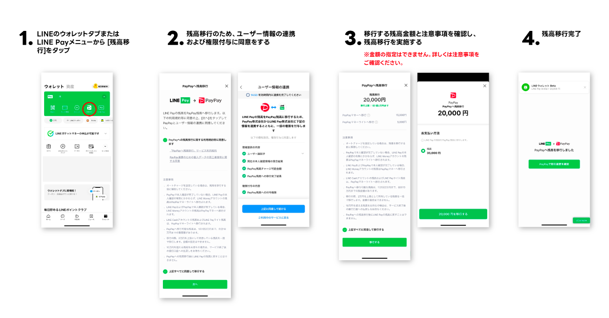 移行上限は1日1回2万円まで。移行期間合計で10万円まで。「LINE Payの残高」は本人確認(eKYC)済みのユーザーが利用できる「PayPayマネー」と、本人確認なしで利用できる「PayPayマネーライト」の両方に移行できる。「LINE Payライト残高」が移行できるのは「PayPayマネーライト」のみとなる。