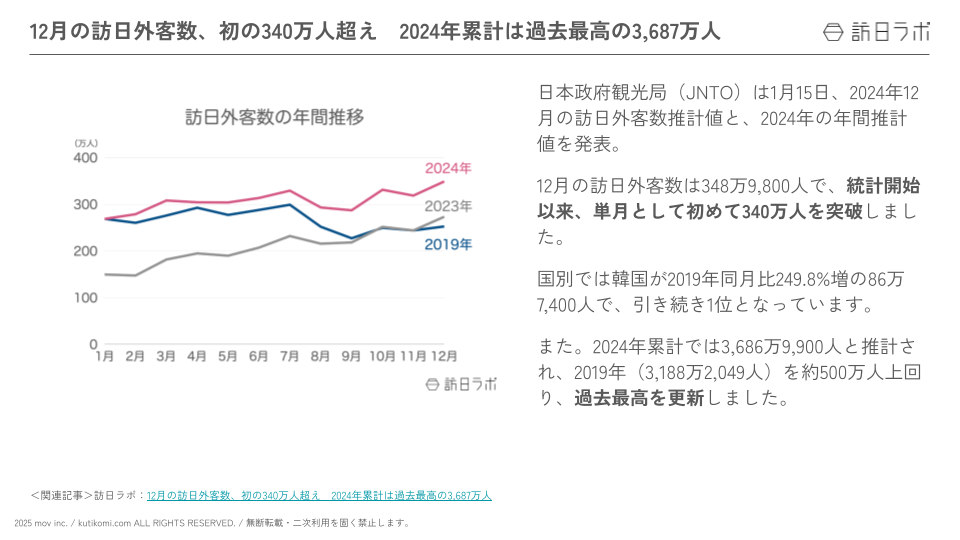 また、日本政府観光局(JNTO)の発表によると、2024年12月の訪日外客数は348万9,800人で、統計開始以来初めて340万人を突破したとのこと。2024年累計では3,686万9,900人と推計され、2019年の記録を更新し過去最高となった。