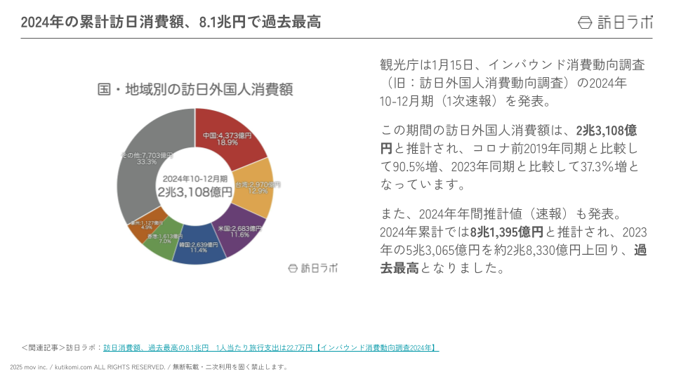 movが運営する訪日ラボは、「インバウンド情報まとめ【2025年1月前編】」を公開した。インバウンドに関する最新トレンド・データ、政府・自治体・企業などのインバウンド関連の取り組みなどに関する情報をまとめたレポートとなっている。