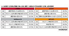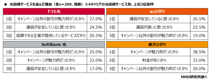 あわせて「光回線サービスを選んだ理由」を聞くと、ドコモ光、SoftBank光が「キャンペーン以外の割引が魅力的」、auひかりが「通信が安定していると思った」、楽天ひかりが「キャンペーンが魅力的」が最多だった。