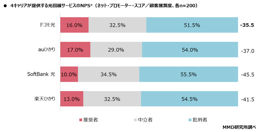 4キャリアの光回線サービスについて「NPS(ネット・プロモーター・スコア/顧客推奨度)」を算出すると、「ドコモ光」が-35.5でもっとも高く、「auひかり」-37.0、「楽天ひかり」-41.5、「SoftBank光」-45.5の順で続いた。