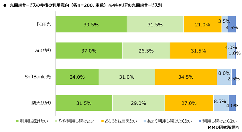 「光回線サービスの今後の利用意向」を聞くと、「利用し続けたい+やや利用し続けたい」は、「ドコモ光」71.0%がもっとも多く、「auひかり」63.5%、「楽天ひかり」60.5%、「SoftBank光」55.0%と、NPSと同じ順で並ぶ。