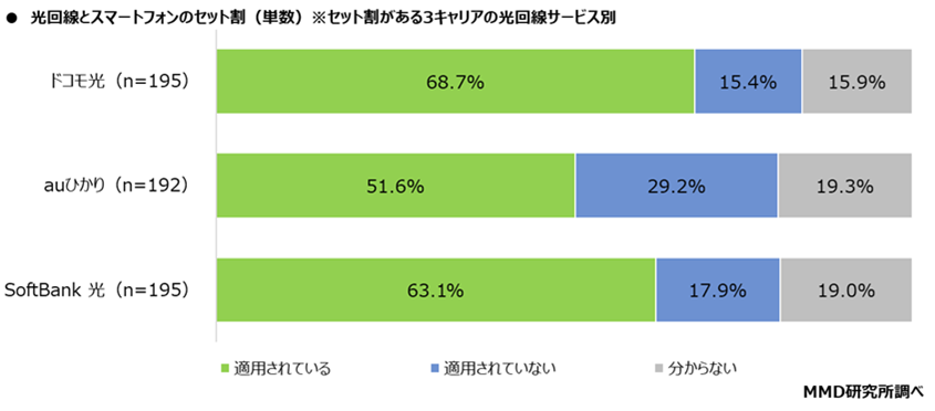 最後にスマホとのセット割があるドコモ光、auひかり、SoftBank光利用者でスマホを持っている582人に、「光回線とスマートフォンのセット割」について聞くと、「適用されている(利用している割合)」は「ドコモ光」68.7%が最多で、「SoftBank光」63.1%、「auひかり」51.6%が上位だった。