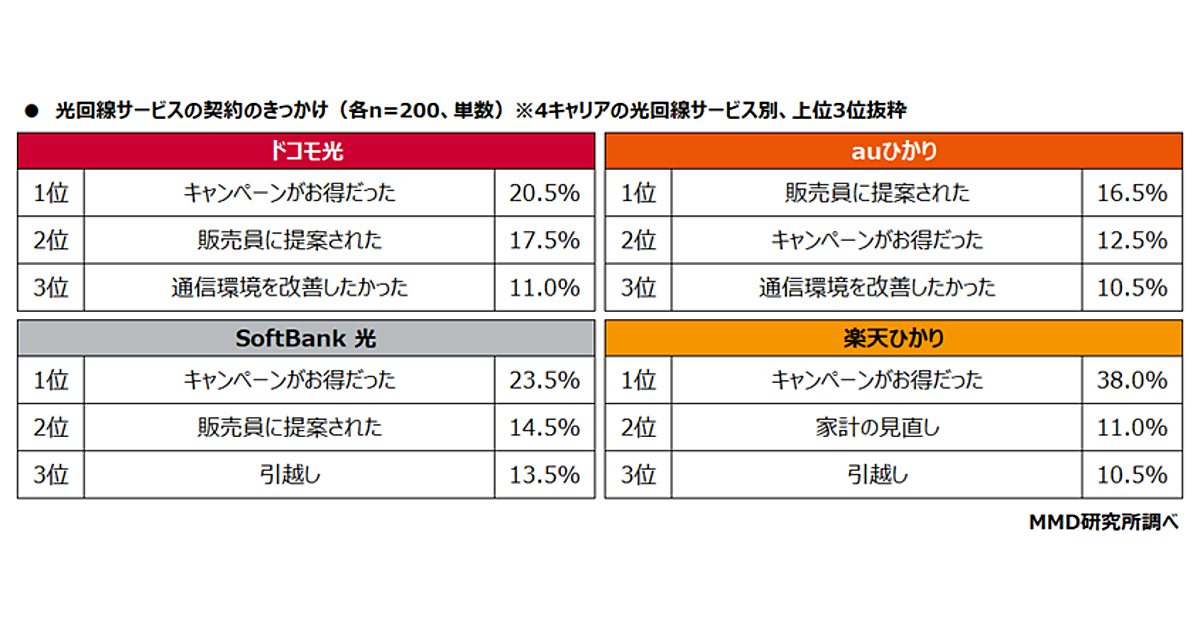 まず「光回線サービスを契約したきっかけ」を聞くと、ドコモ光、SoftBank光、楽天ひかりは「キャンペーンがお得だった」、auひかりは「販売員に提案された」がそれぞれ最多だった。