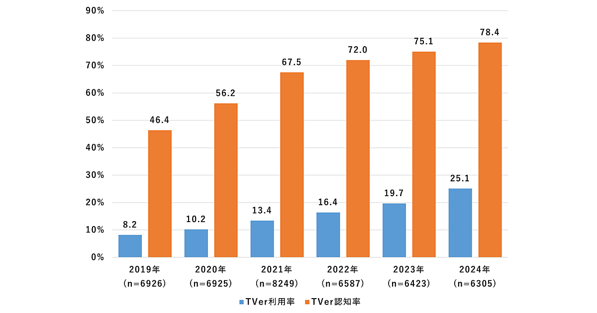 TVerの認知率、利用率は年々増加傾向にある。2019年の認知率は46.4%だったが、2024年には78.4%まで伸長した。また、2019年の利用率は8.2%だったが、2024年には25.1%まで達した。