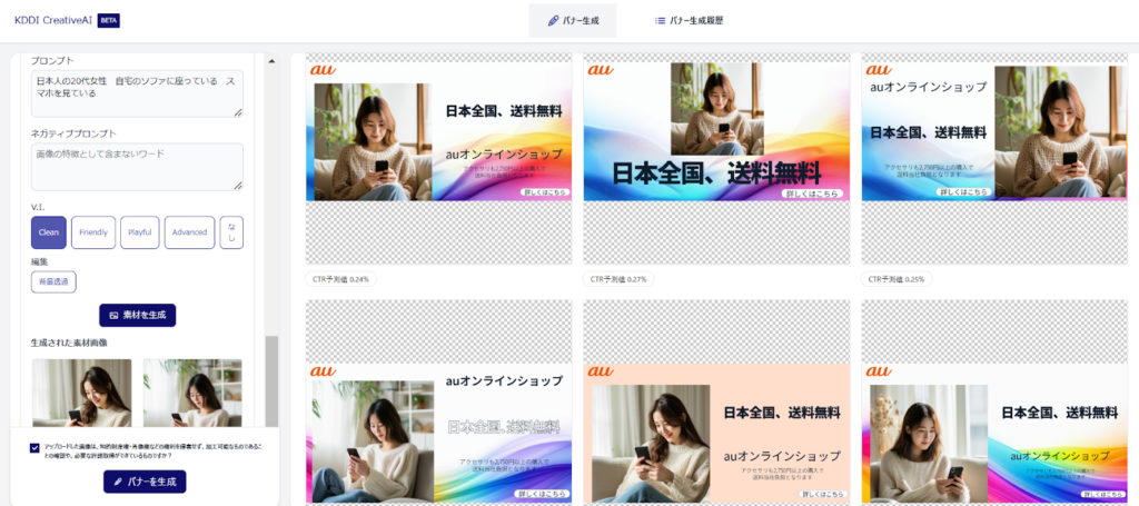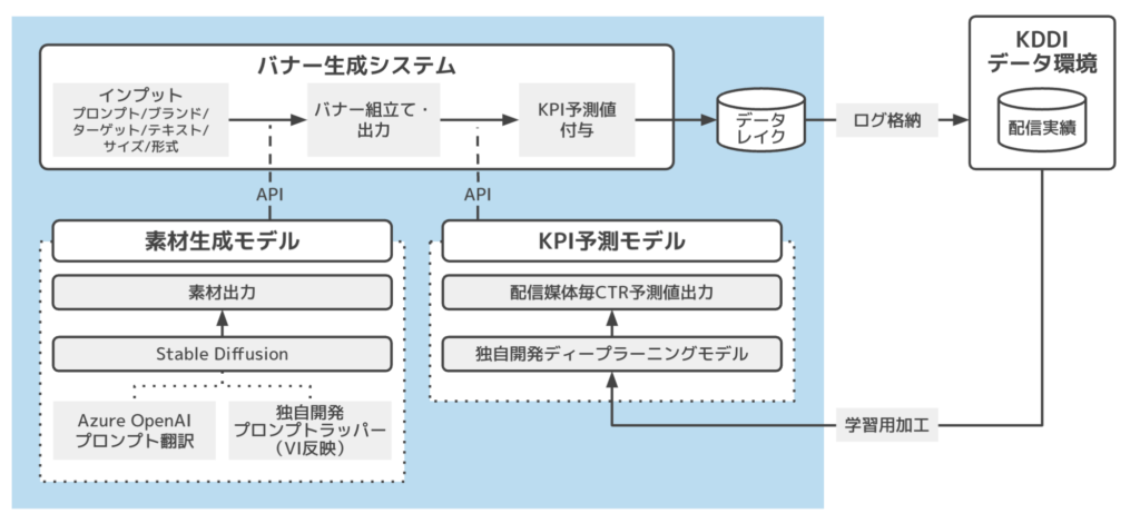 KDDIのブランドガイドラインや、auブランド指針「au VISUAL IDENTITY」に遵守する一貫したブランドイメージの広告バナー画像を半自動で生成し、配信実績にもとづく効果の高いクリエイティブを自動で選別する。さまざまな制約条件の考慮が必要で属人化しがちなブランド管理業務の効率化と平準化はオンライン広告を出稿する法人の共通課題と捉え、システム提供の検討を進めて広告クリエイティブ制作の効率化と高度化に貢献する。