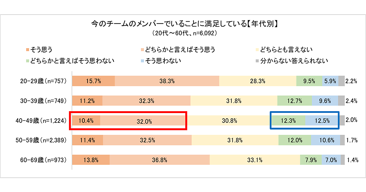 まず「今のチームのメンバーでいることに満足している」(そう思う+どちらかと言えばそう思うの合計)を見ると、20代:54.0%、30代:43.5%、40代:42.4%、50代:43.9%、60代:50.6%で、40代がもっとも低く、「今のチームのメンバーでいることに不満」(そう思わない+どちらかと言えばそう思わないの合計)は、40代:24.8%で40代がもっとも高かった。