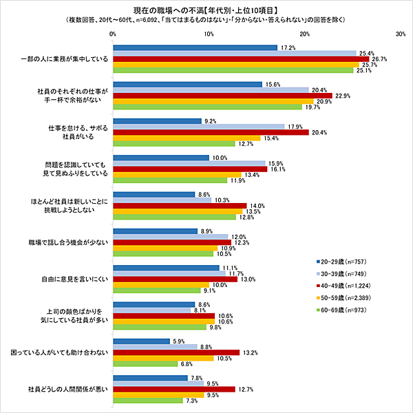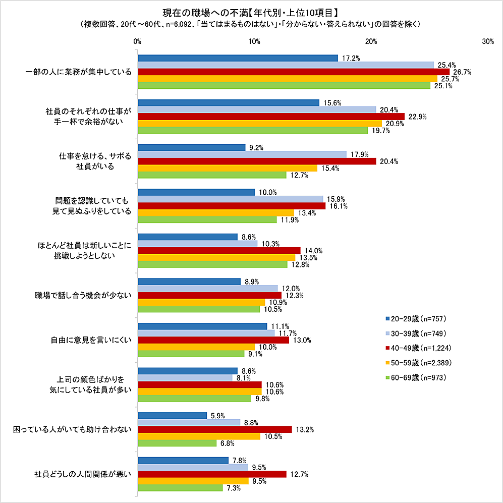 40代の回答では「一部の人に業務が集中している」「社員のそれぞれの仕事が手一杯で余裕がない」「仕事を怠ける、サボる社員がいる」が上位となっている。