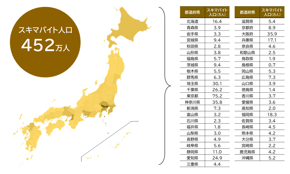 まず「スキマバイトを行った経験」(過去3年以内)を聞くと、「ある」と回答したのは6.5%。直近1年以内に限るとそのうちの82.0%が経験があると回答している。人口を簡易推計すると、1年以内のスキマバイト経験者は452万人。東京をはじめとする都市圏で多い。