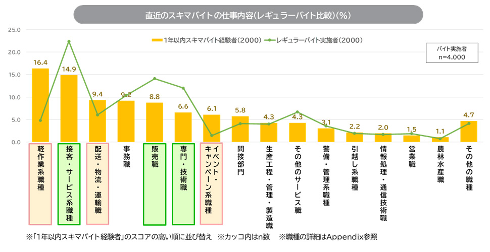 「スキマバイトの仕事内容」を聞くと、「軽作業系職種」16.4%が最多。以下「接客・サービス系職種」14.9%、「配送・物流・運輸職」9.4%が続く。“短期の単発仕事”というスキマバイトの性格がうかがえる。応募方法では「スキマバイト専用の求人アプリ・サイト」が6割前後を占める。