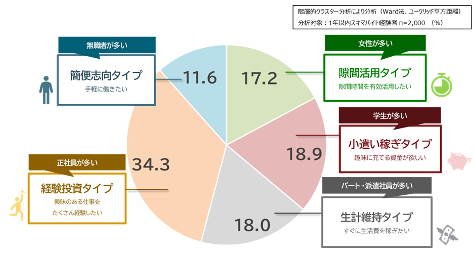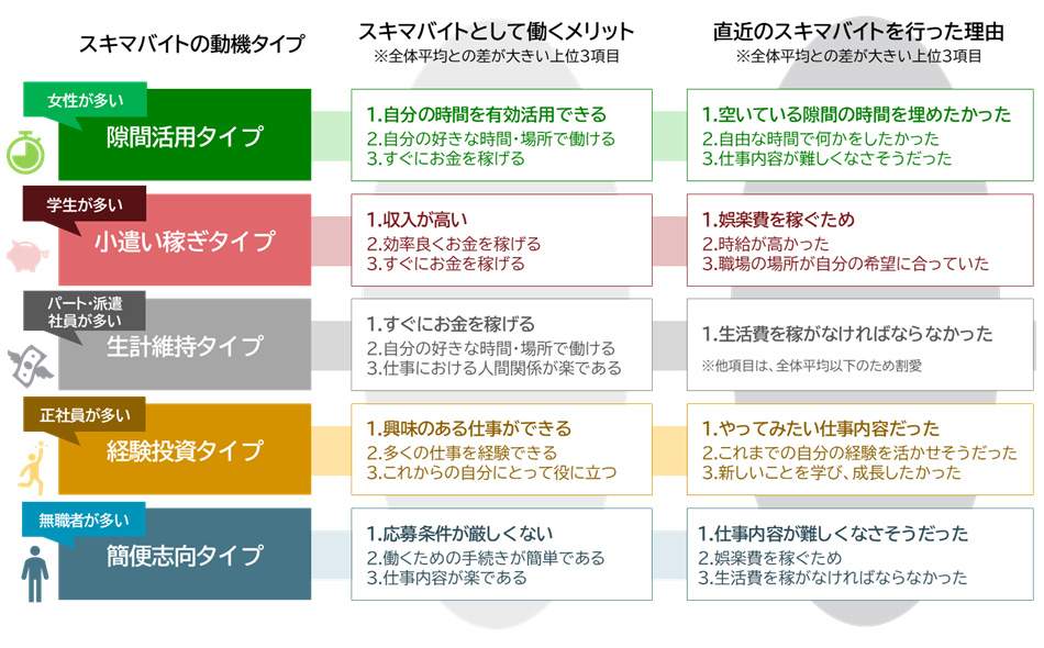 スキマバイト経験者(1年以内)も「スキマバイトとして働くメリットや理由」を聞くと、「隙間活用」「小遣い稼ぎ」「生計維持」「経験投資」「簡便志向」の5タイプにおおよそ分かれる。