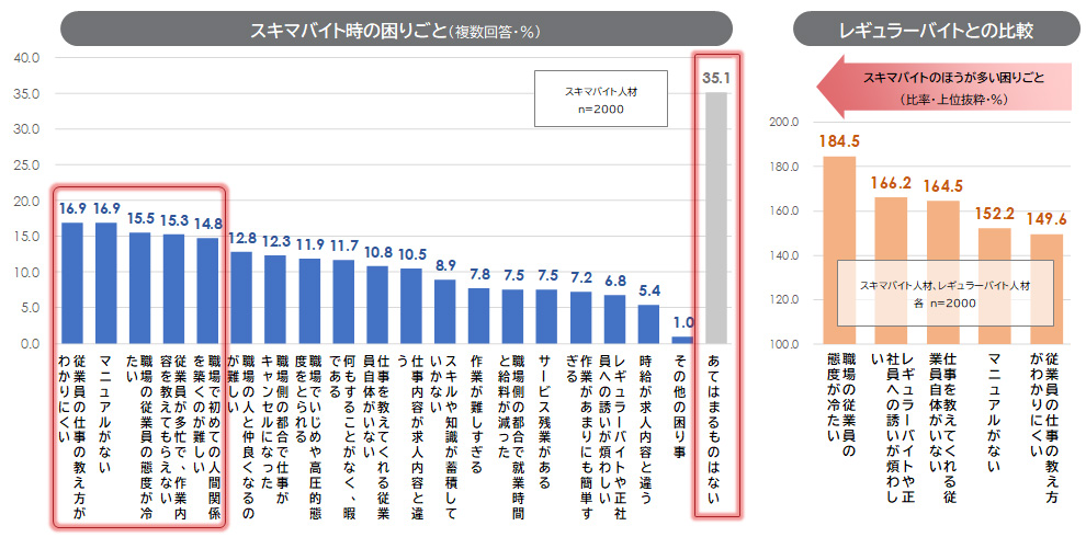 「スキマバイト時の困りごと」は、「あてはまるものはない」35.1%が最多だが、「従業員の仕事の教え方がわかりにくい」「マニュアルがない」「職場の従業員の態度が冷たい」などが15%前後で上位だった。