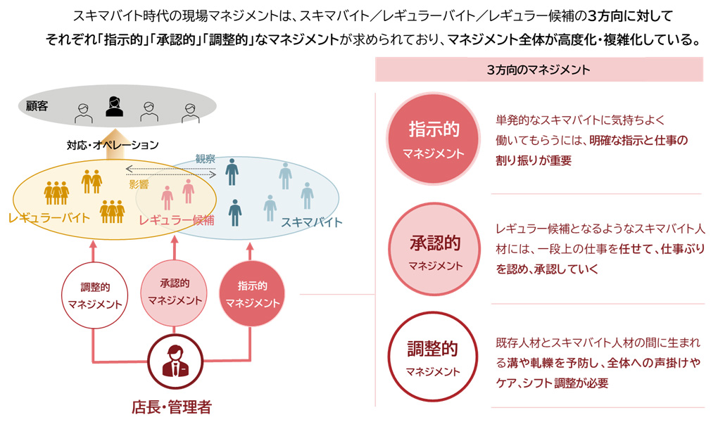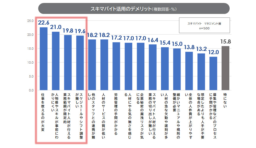 一方で店長・管理者側に「スキマバイト活用のデメリット(課題)」を聞くと、「仕事を教えるのが大変」が最多で、以下「人物像やスキルが事前にわかりにくい」「業務範囲が限定的」「スケジュールやシフト調整が難しい」が続いた。店長・管理者側は、スキマバイト/レギュラーバイト/レギュラー候補の3方向に対して異なるマネジメントが求められると考えられる。