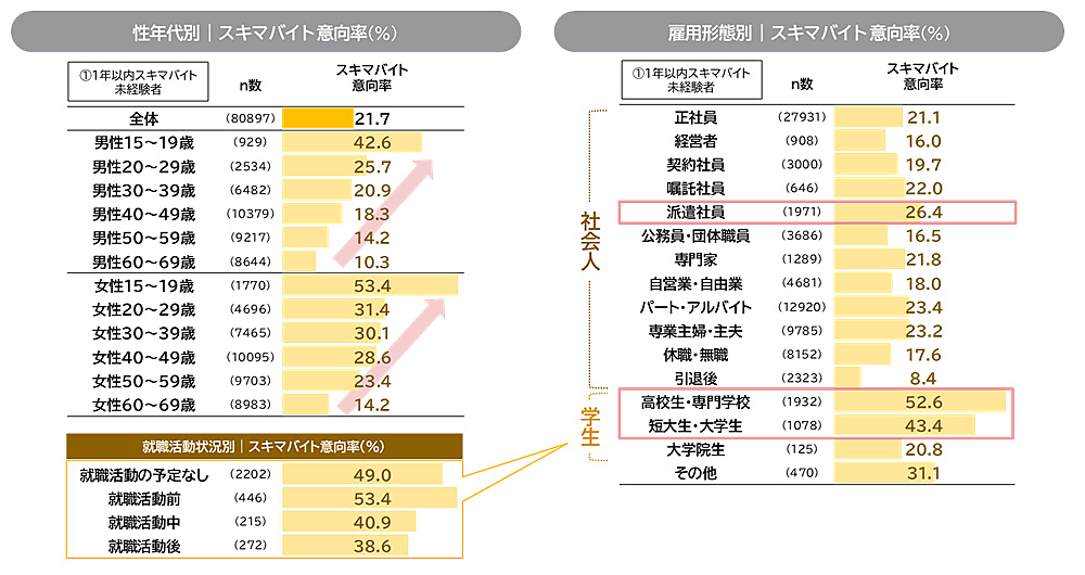 性年代別で意向をみると、男女ともに若年層のスキマバイト意向率が高い。属性別では、社会人層では派遣社員、学生層では「高校生・専門学校」「短大生・大学生」の意向率が高い。また、学生を就職活動状況別に見ると、「就職活動前」の学生が高かった。