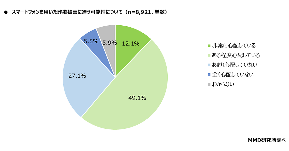 10,000人のうち通信会社を契約している8,912人に、まず「スマホを用いた詐欺に遭うことを心配しているか」と聞くと、「非常に心配している」12.1%、「ある程度心配している」49.1%で、計61.2%が心配していた。