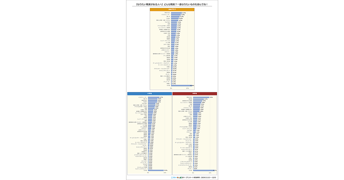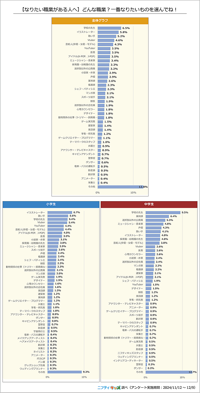 まず「なりたい職業の有無」を聞くと、小学生では95.4%、中学生では89.8%が「ある」と回答。具体的な職業を聞くと、小学生は「イラストレーター」「歌い手」「学校の先生」、中学生は「学校の先生」「薬剤師」「公務員」がトップ3で、ともに「学校の先生」がランクインしている。