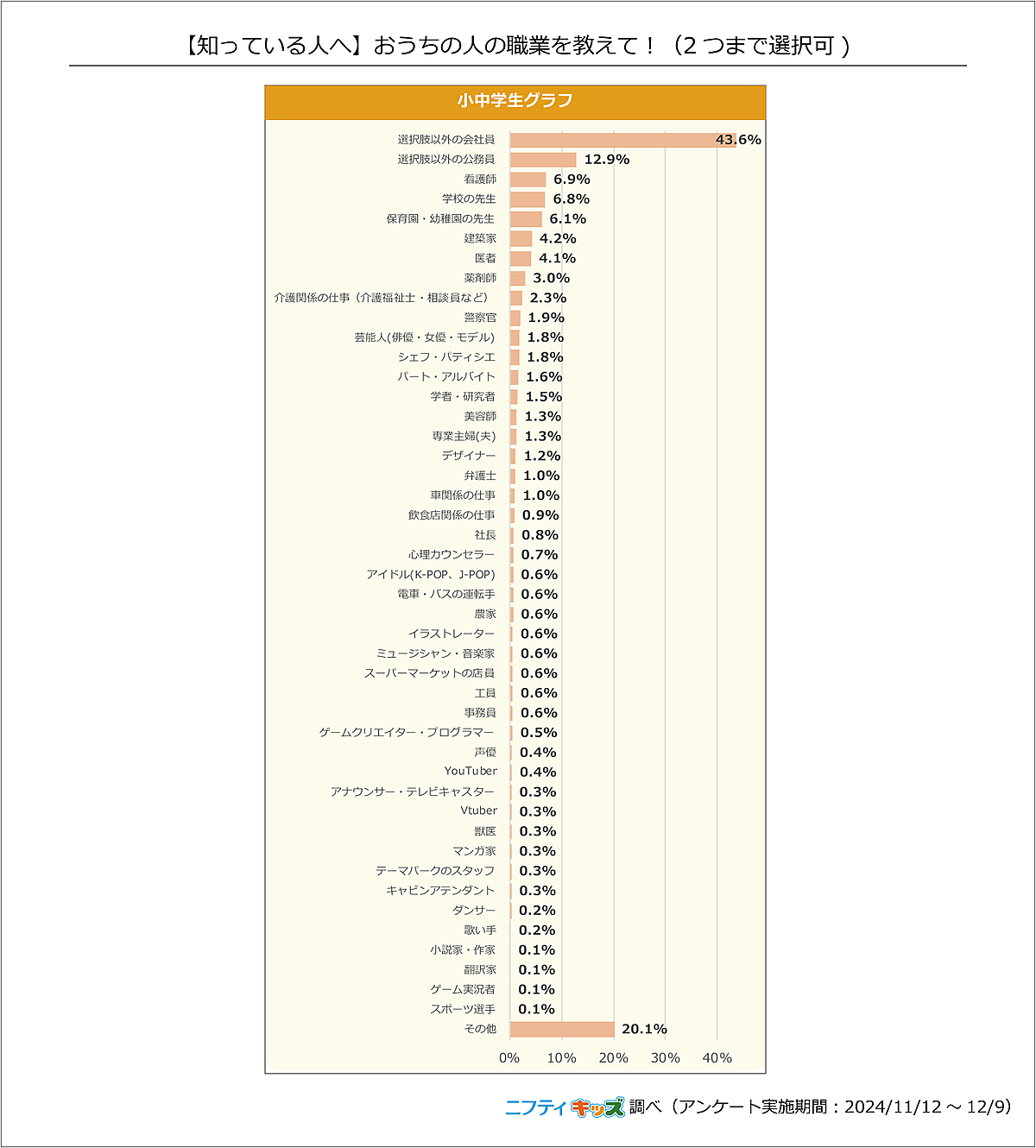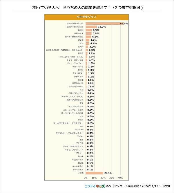 そこで「おうちの人の職業を知っているか」を聞くと、91.5%が「知っている」と回答。具体的な職業を聞くと、「会社員」43.6%、「公務員」12.9%が上位で、「看護師」6.9%、「学校の先生」6.8%、「保育園・幼稚園の先生」6.1%がそれに続く。