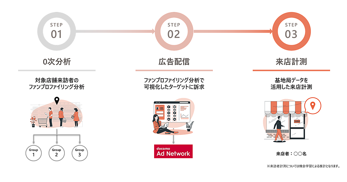パッケージは「0次分析」「広告配信」「来店計測」の3ステップで構成。0次分析は基地局情報や会員データからユーザー属性・行動推計・興味関心を推定する「docomo Sense」を活用。商品やサービスの「ファン」を特定して特徴を抽出し、新規獲得と優良顧客化に利活用が可能なファンプロファイリング分析でペルソナ(顧客像)を作成する。広告配信は、そのペルソナに合ったセグメントを作成して実施する。