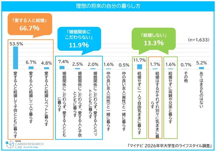 次に「自身の理想の将来の暮らし方」を聞くと、「愛する人と結婚」という人たちが計66.7で最多。「結婚しない」13.3%、「婚姻関係にこだわらない」11.9%を大きく上回っている。