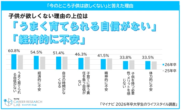 また「子育てに関する考え」を聞くと、前年同様「育児休業を取って子育てしたい」57.1%が特に多く、「今のところあまり子供は欲しくない」17.7%を上回る。なお「子供が欲しくない理由」では、「うまく育てられる自信がない」60.8%、「経済的に不安」54.5%といった声があがる。