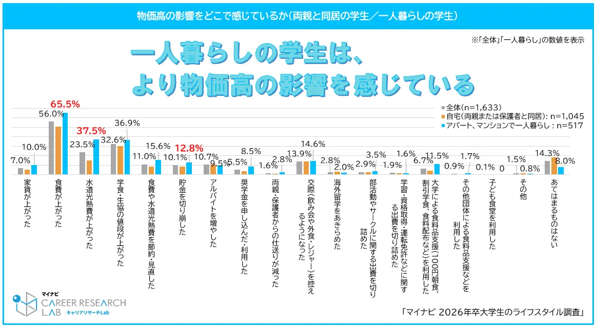 「昨今の物価高」については、「物価上昇の影響を感じる」85.7%で、前年より5.3pt増。具体的には「食費が上がった」56.0%、「学食・生協の値段が上がった」32.6%、「家賃が上がった」7.0%といった意見が上位だった。特に一人暮らしの学生は影響が顕著で、いずれの項目でも全体数値を超える。