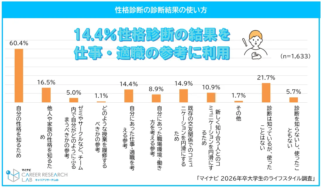 最近、若年層を中心にMBTIなどの性格診断テストが流行している。そこで2026年卒大学生に「性格診断テストの診断結果を日ごろどのように使っているか」を聞くと、「自分の性格を知るため」60.4%が特に多く、「他人や家族の性格を知るため」16.5%に大きく差をつけている。「自分にあった仕事・適職を考える参考」は14.4%で、「就活のための自己分析で活用した。診断結果のキーワードを自分軸として利用している」「自分の適性に合った職業を知ることで、企業選びやインターンシップの選択が簡単になった」などの声があがった。