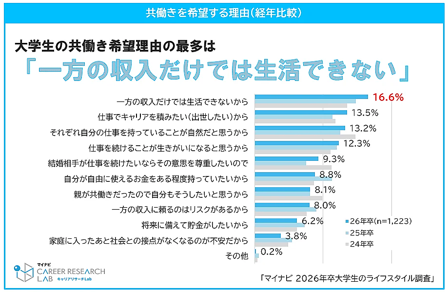 そこで「共働きを希望する理由」を聞くと、「一方の収入だけでは生活できないから」16.6%が3年連続増で最多。「仕事でキャリアを積みたい(出世したい)から」13.5%も増加傾向にある。一方で「それぞれ自分の仕事を持っていることが自然だと思うから」13.2%は減少傾向を見せている。