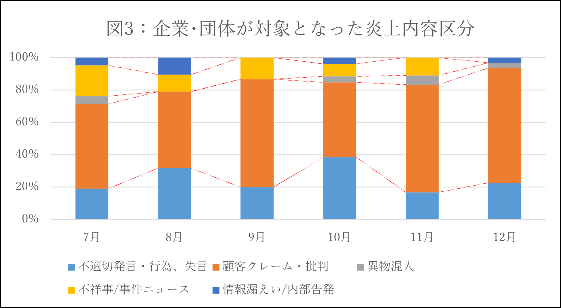 また、個人・著名人の炎上が上期と比較して、5ポイント増の13%まで増加。「他のタレントに対して不適切な言動をしたタレントが炎上」や「展示会に不適切な装いで来場したインフルエンサーに批判が殺到」といった例が挙げられている。