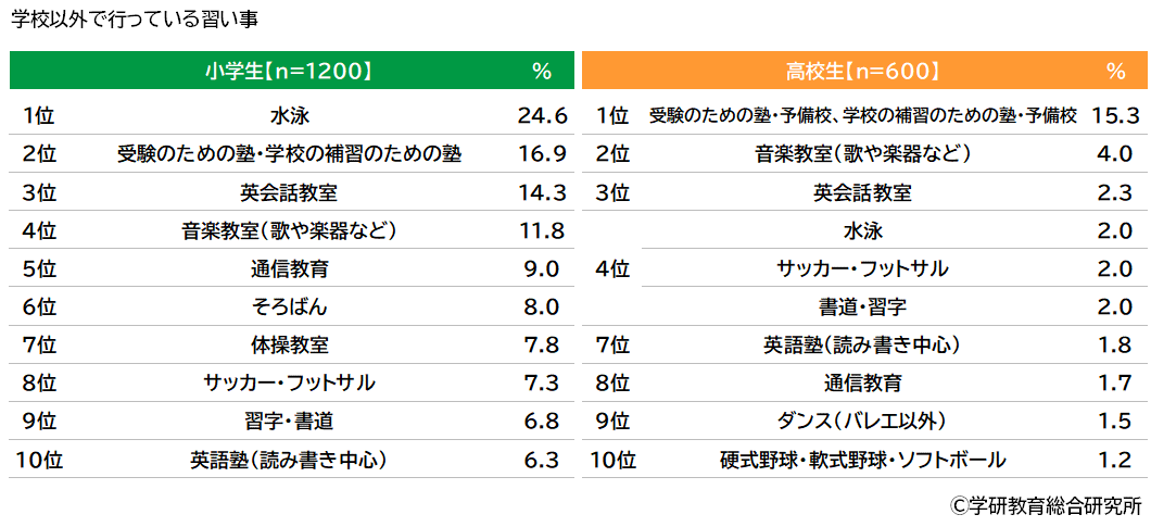 高校生では1位「受験のための塾・予備校、学校の補習のための塾・予備校」(15.3%)、2位「音楽教室」(4.0%)、3位「英会話教室」(2.3%)。