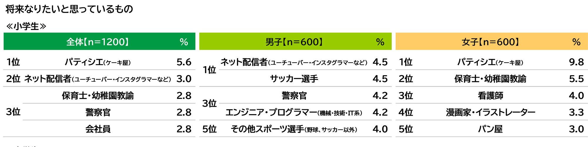 将来なりたい職業、小学生の1位は「パティシエ」(5.6%)、2位は「ネット配信者」(3.0%)。男子の1位は「ネット配信者」「サッカー選手」(4.5%)、女子の1位は8年連続で「パティシエ」(9.8%)だった。