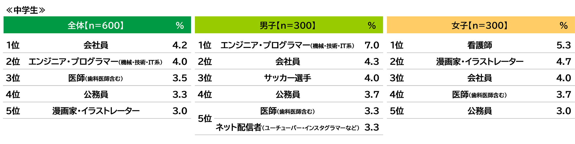 中学生の1位は「会社員」(4.2%)、2位「エンジニア・プログラマー」(4.0%)。男子の1位は「エンジニア・プログラマー」(7.0%)、女子の1位は「看護師」(5.3%)だった。