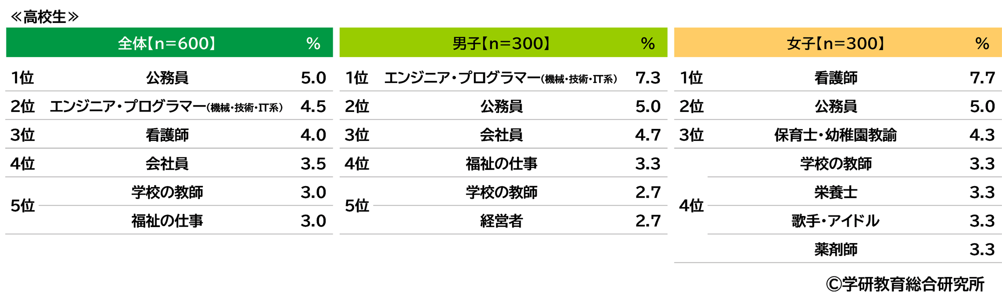 高校生の1位は「公務員」(5.0%)、2位「エンジニア・プログラマー」(4.5%)。男子の1位は、中学生に続き「エンジニア・プログラマー」(7.3%)、女子の1位も中学生に続き「看護師」(7.7%)だった。