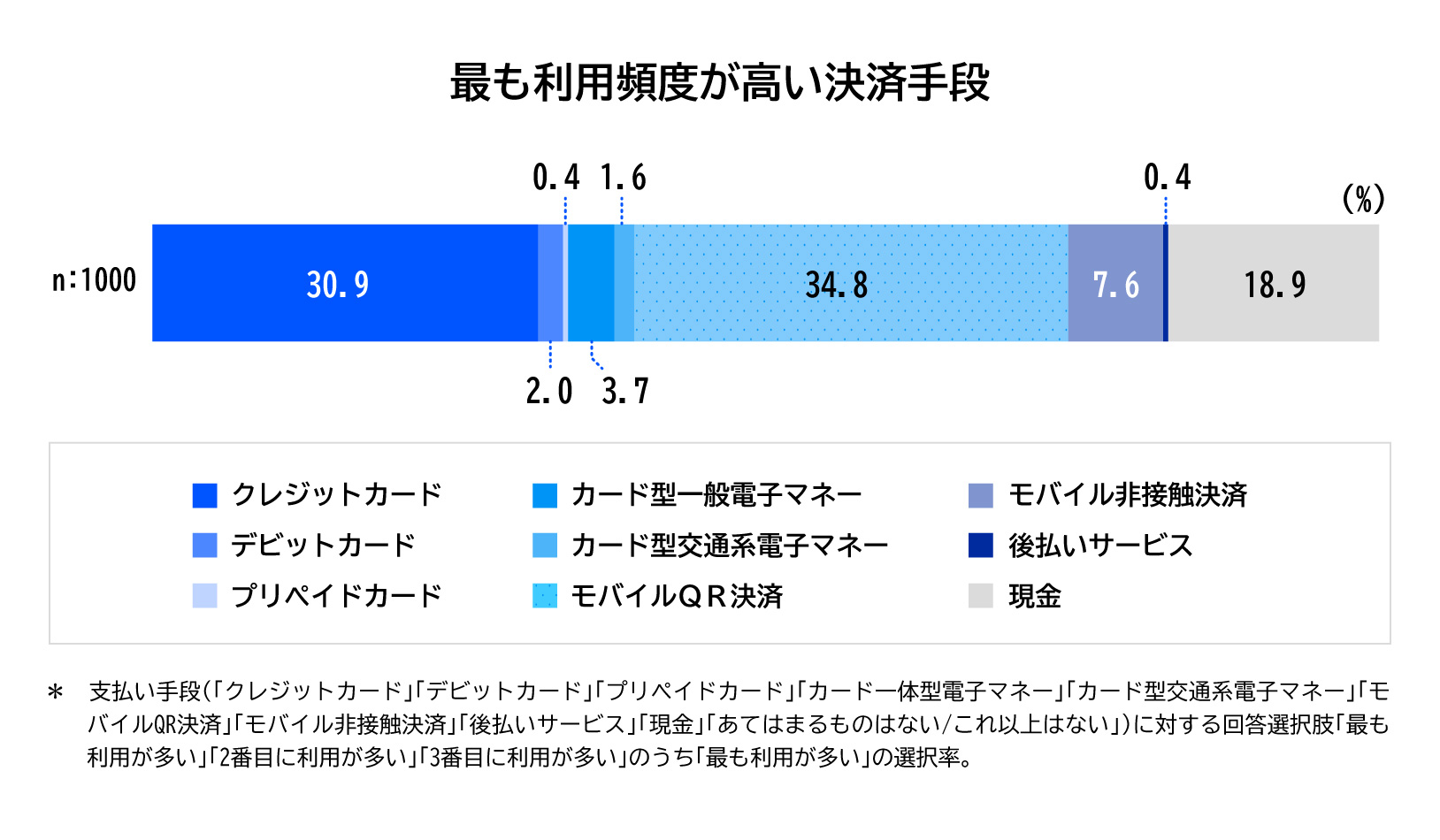 キャッシュレス決済利用者の中で最も利用頻度が高い決済手段は「モバイルQR決済」で34.8%。次いで「クレジットカード」(30.9%)、「現金」(18.9%)と続いた。