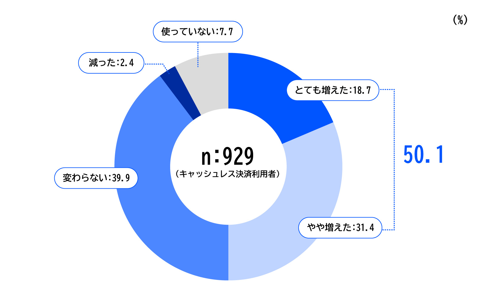 キャッシュレス決済利用者のうち、2024年以降、タッチ決済の利用機会が増えた人(「とても増えた」「やや増えた」の合計)は50.1%だった。