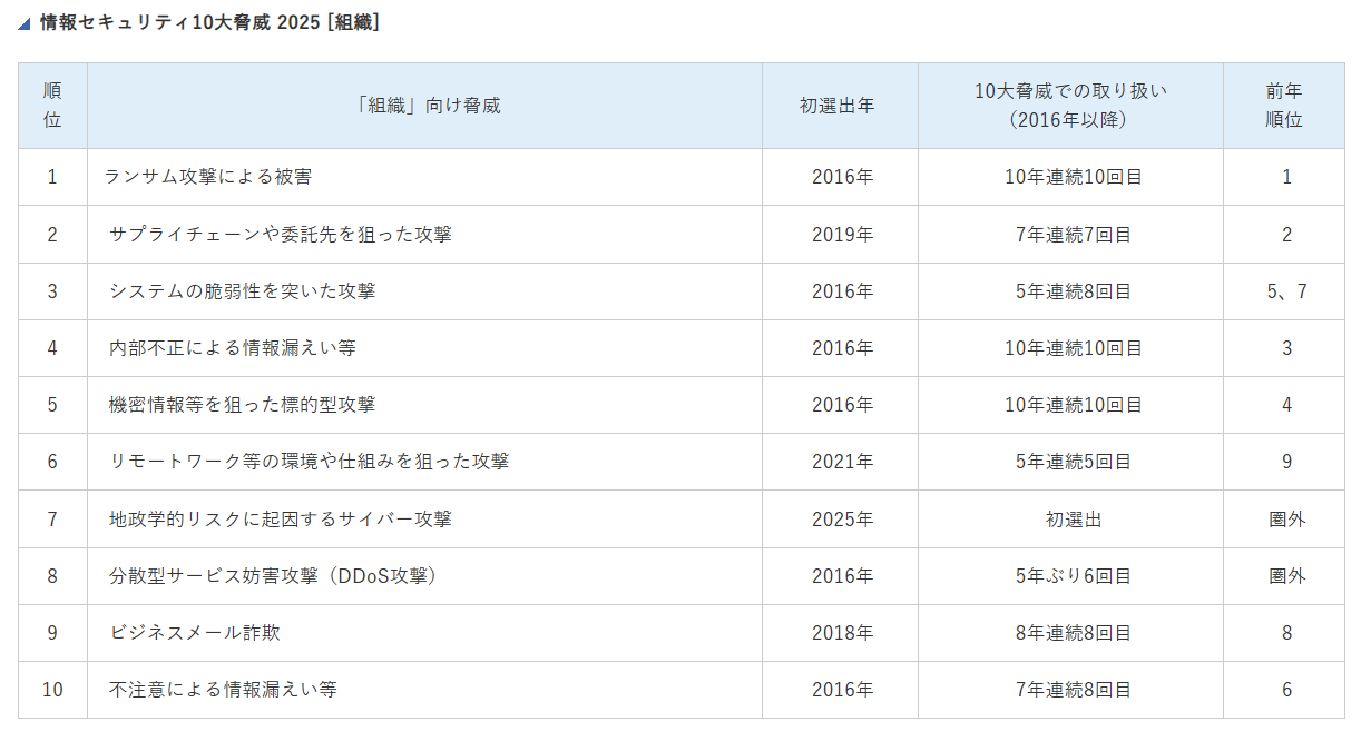 - 情報セキュリティ10大脅威2025(組織)