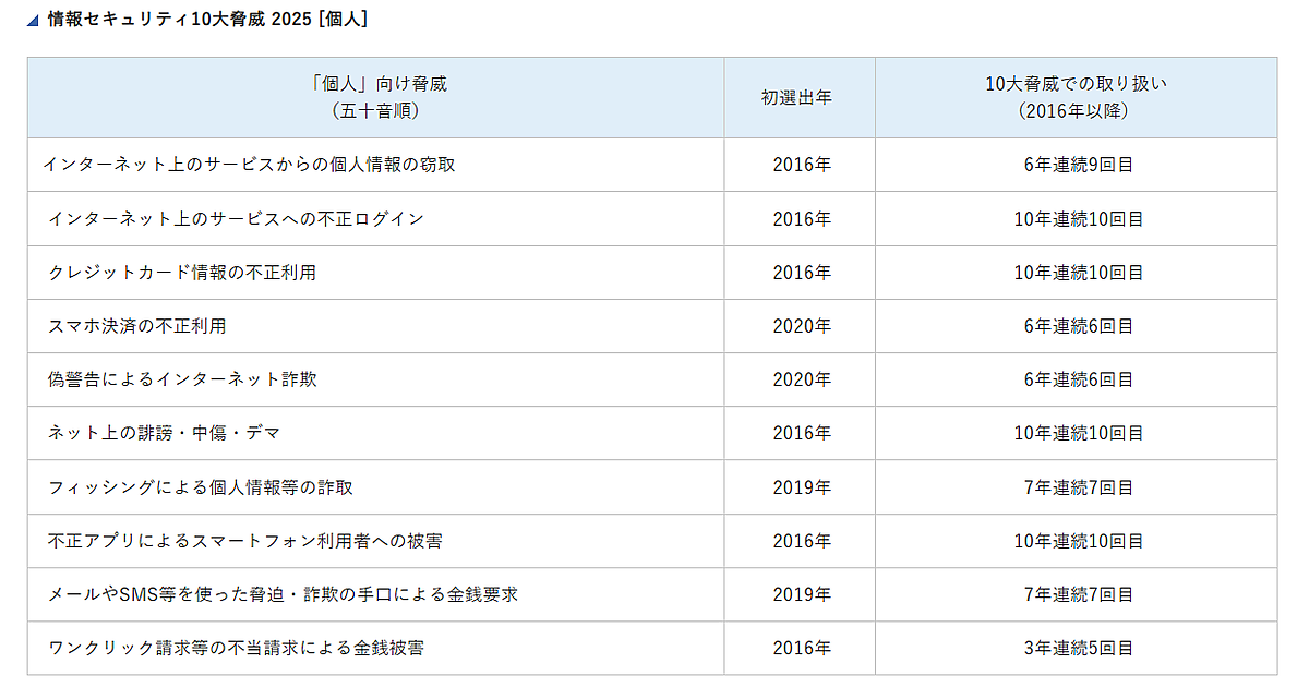 - 情報セキュリティ10大脅威2025(個人)